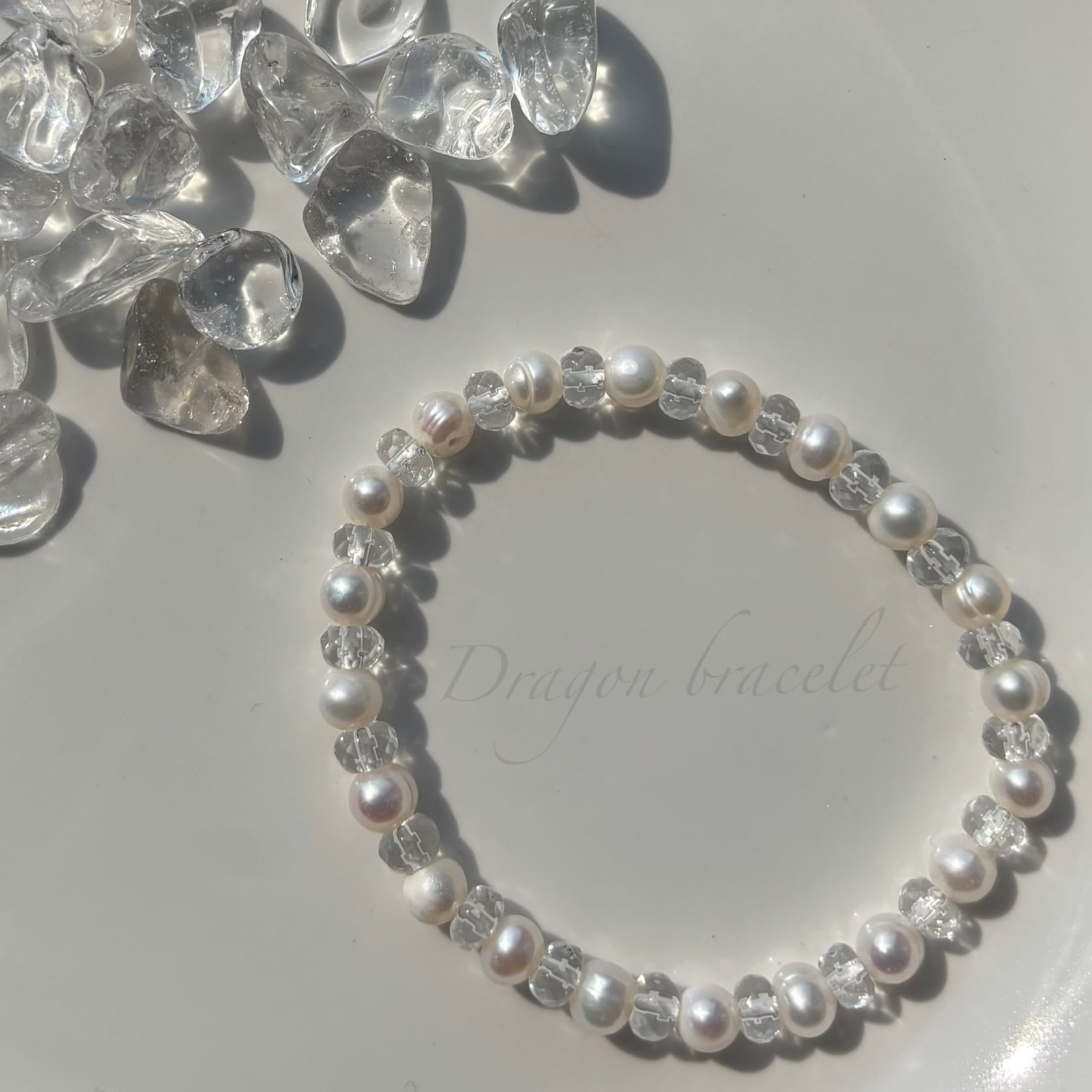 柔らかな輝きを放つ淡水バロックパールと、澄んだ光を宿す水晶を組み合わせたブレスレット。