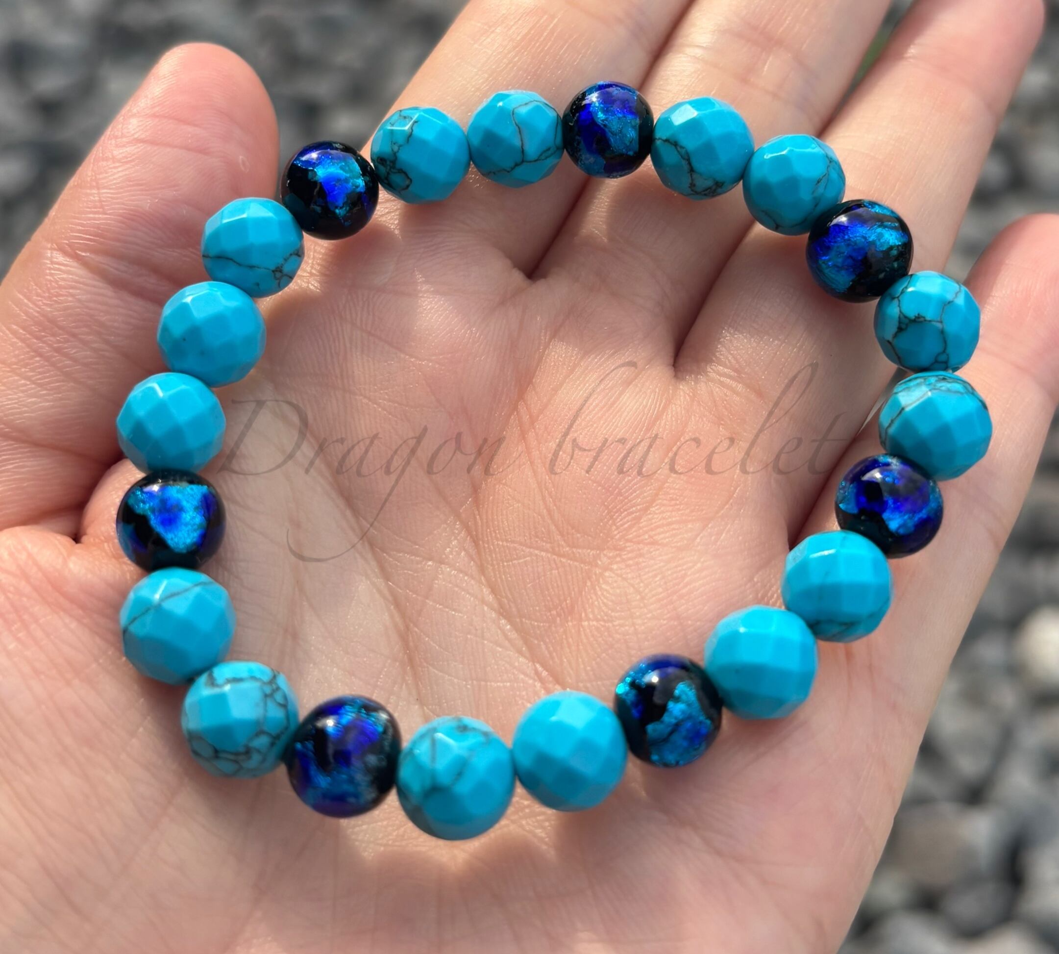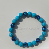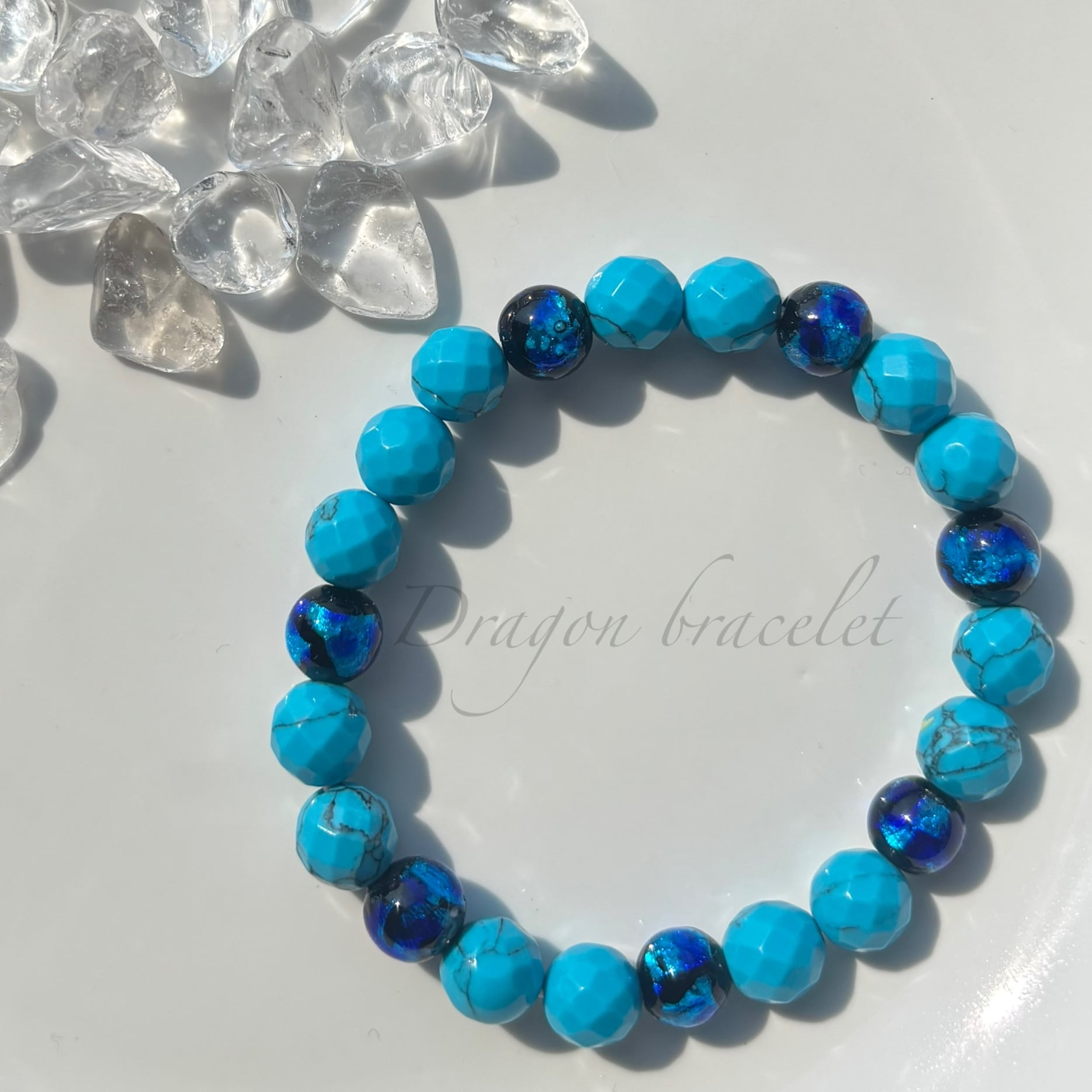 鮮やかなターコイズブルーの青ハウライトに、奥行きある輝きを放つホタルガラスを組み合わせた、印象的なブレスレット。