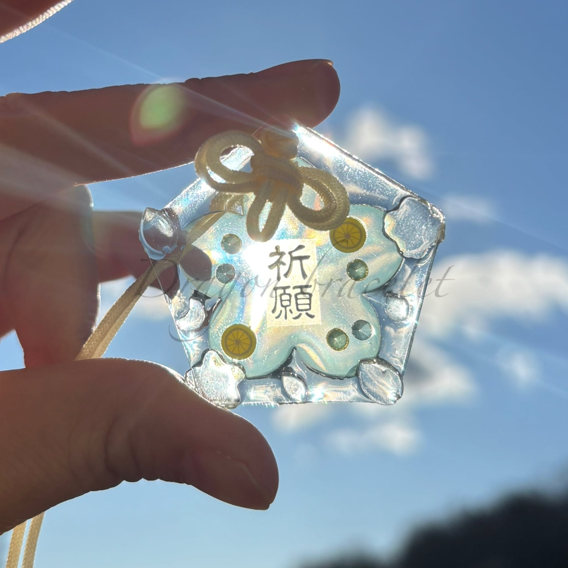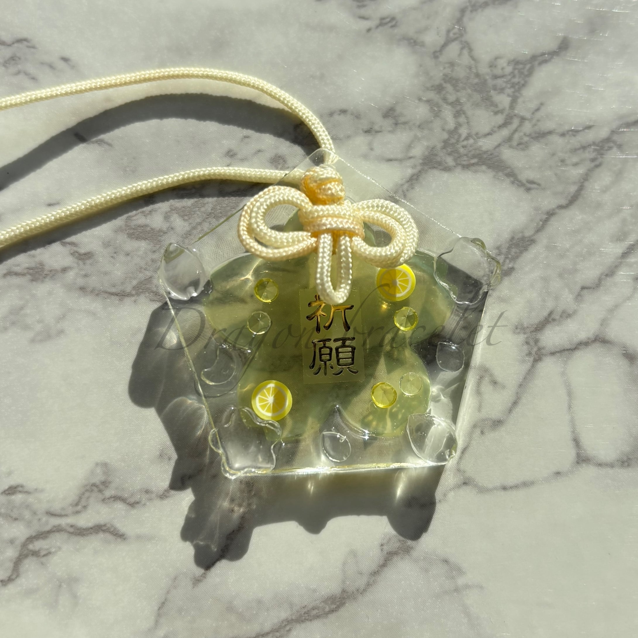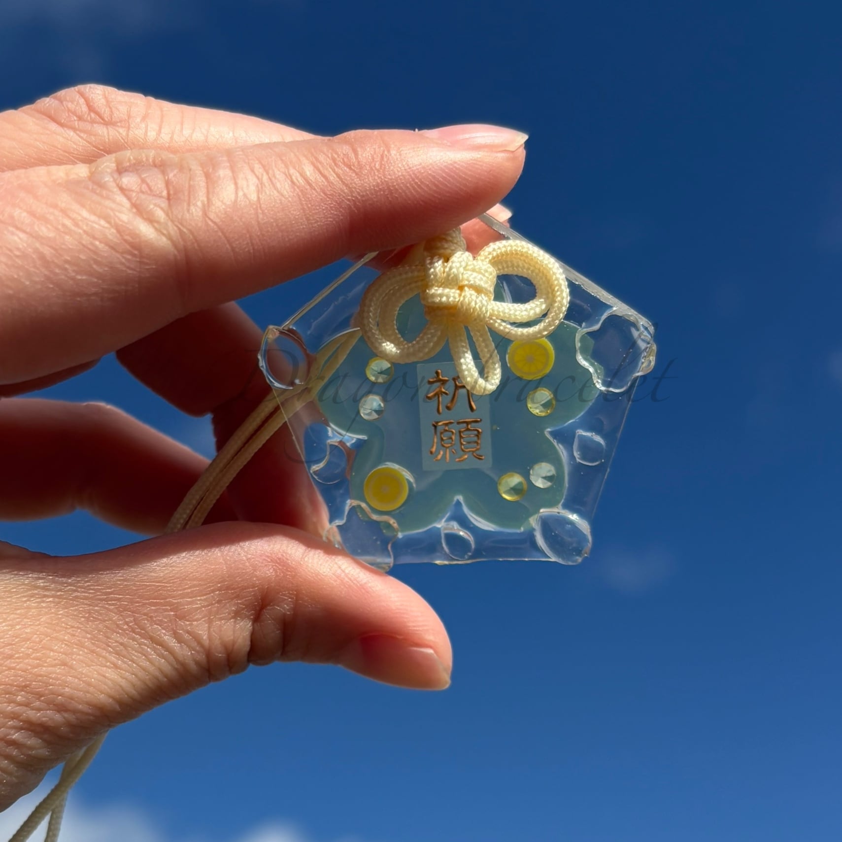 透明感のあるレジン製のお守りキーホルダーです。