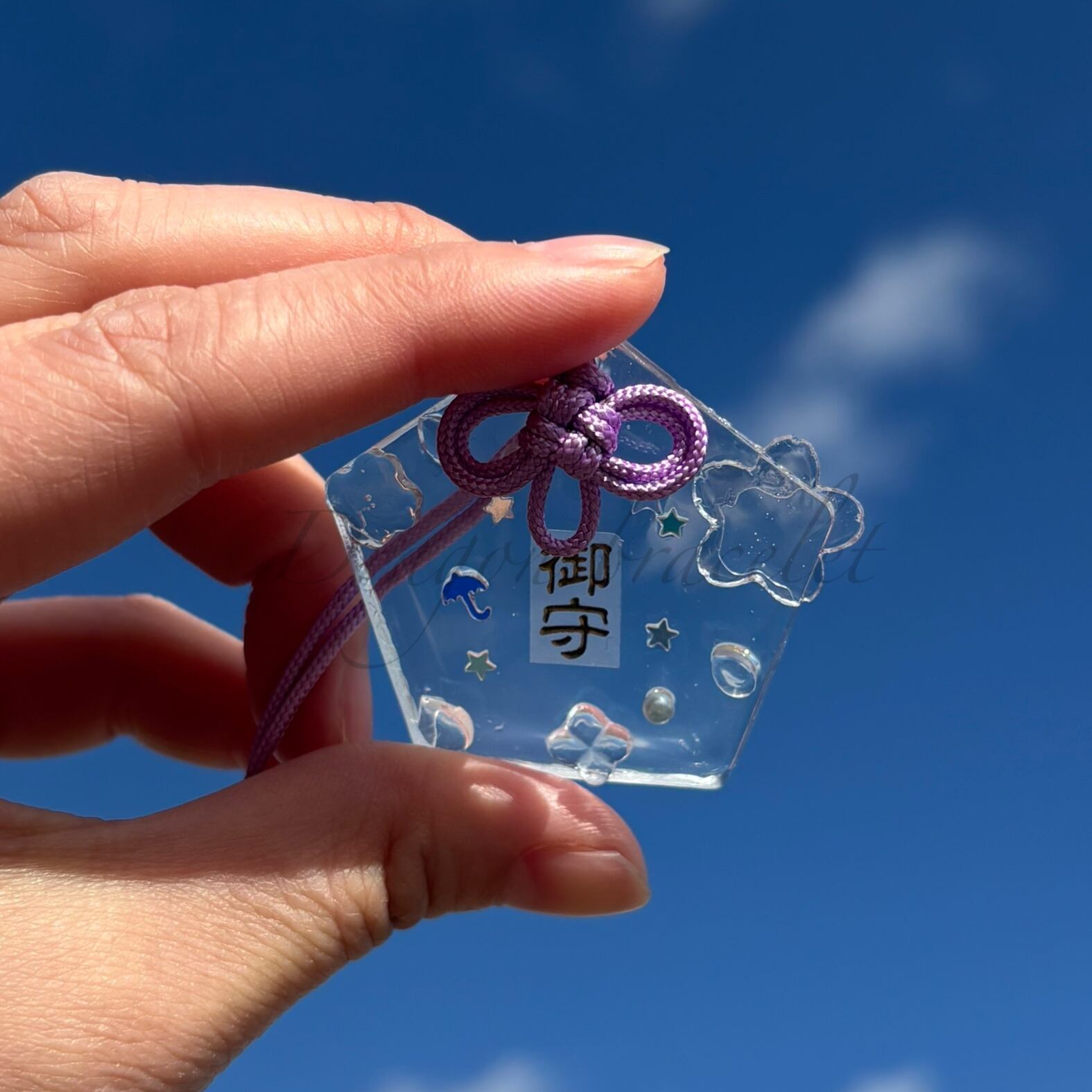 透明感のあるレジン製のお守りキーホルダーです。
