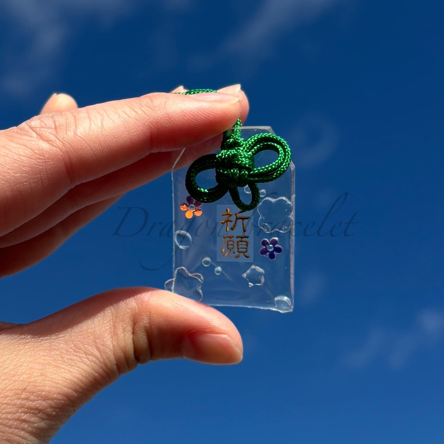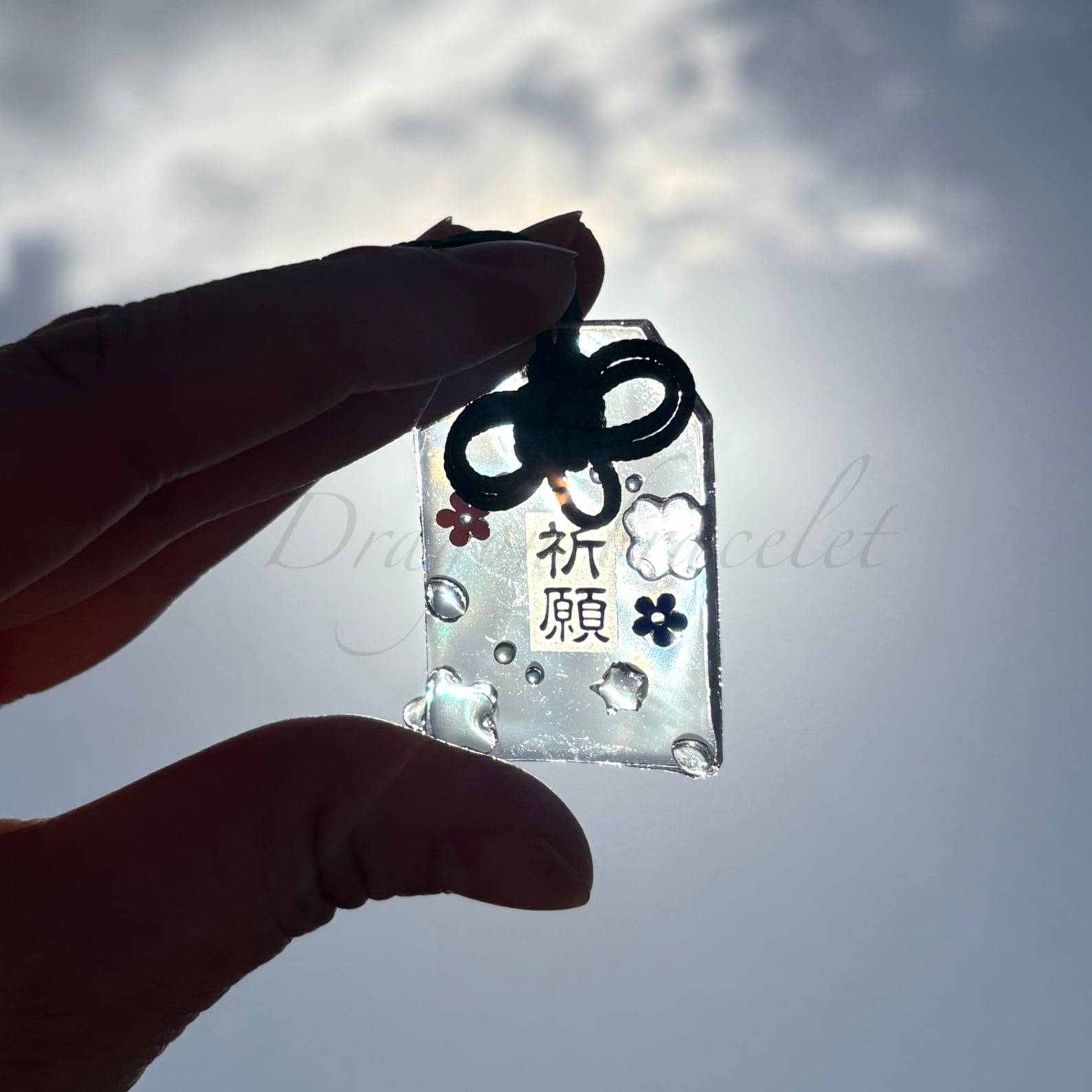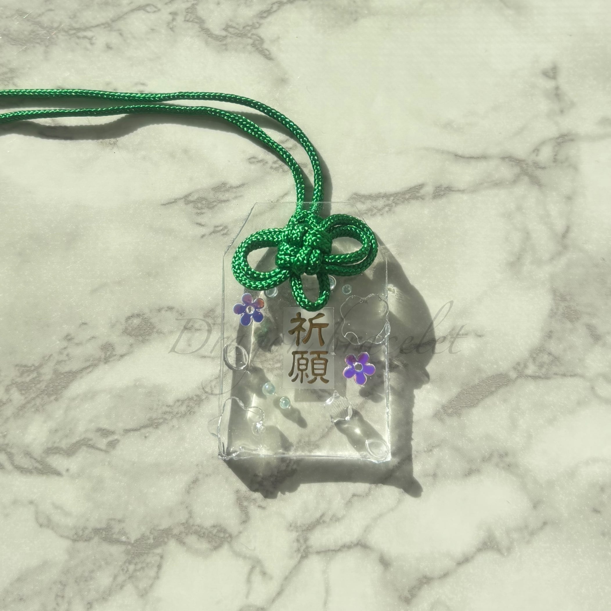 「祈願」の文字と小さなモチーフを閉じ込めた