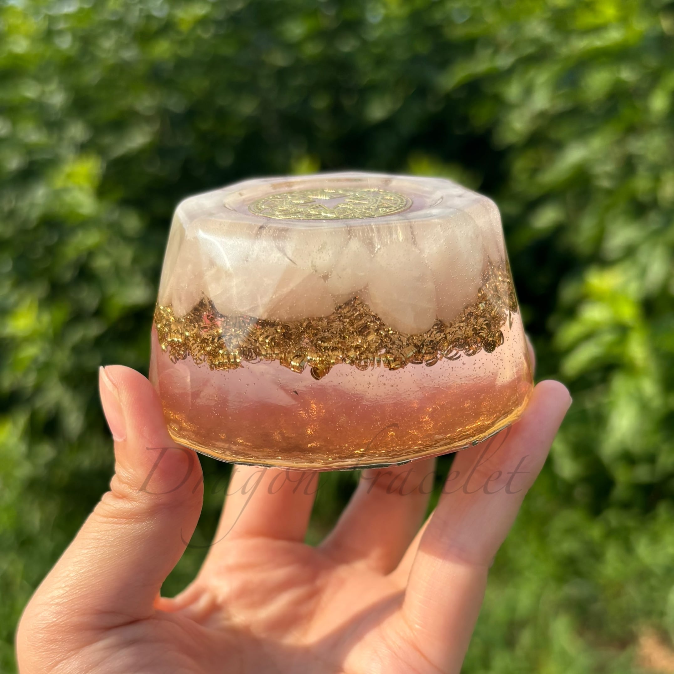 ローズクォーツをたっぷりと閉じ込め、神秘的なホロスコープ模様をあしらったオルゴナイト。
