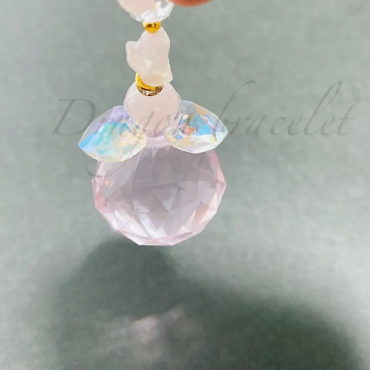 優しいピンクのローズクォーツが光を受けてきらめくサンキャッチャー。
